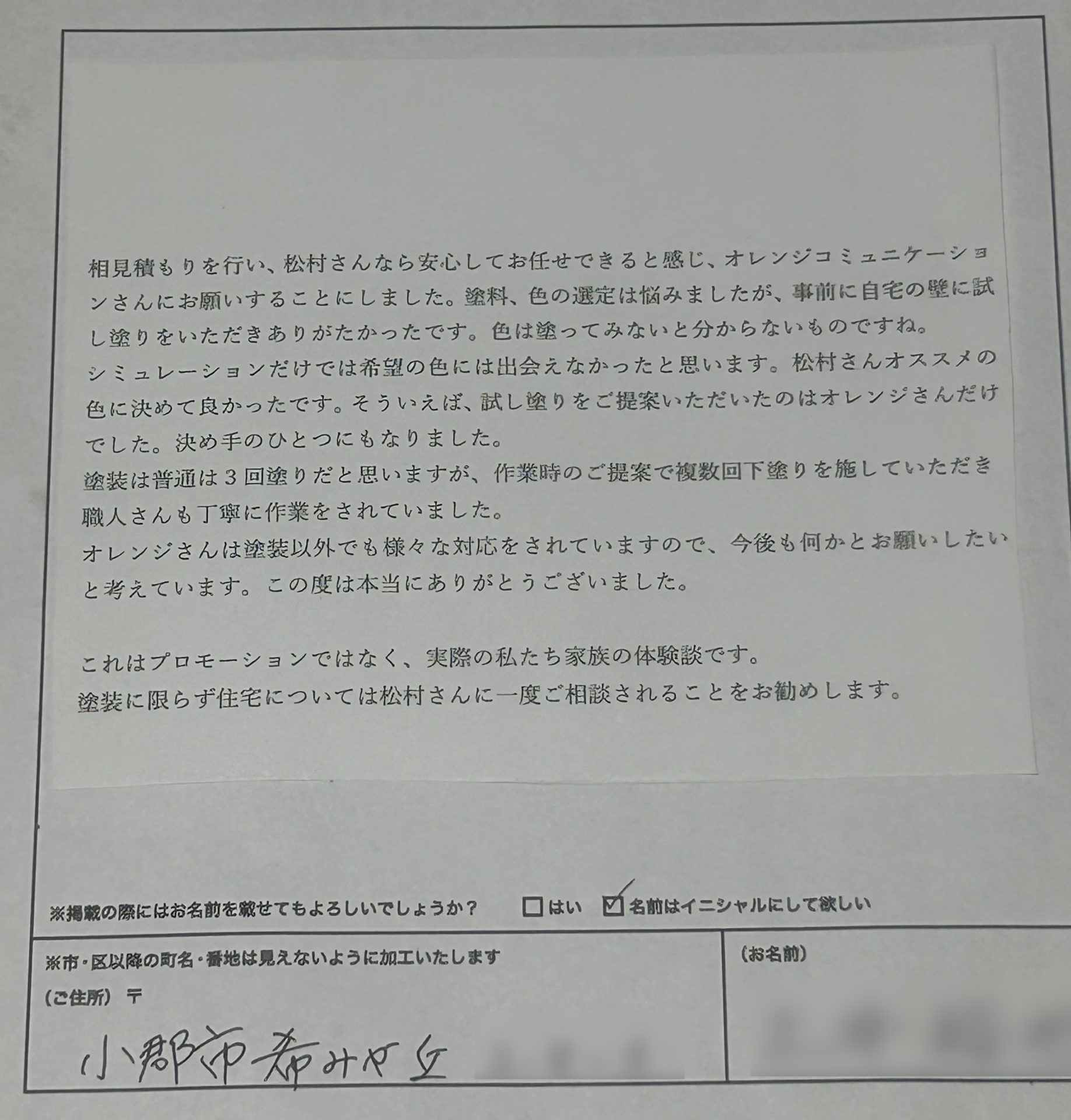 相見積もりを行い、松村さんなら安心してお任せできると感じ、オレンジコミュニケーションさんにお願いすることにしました。 塗料、色の選定は悩みましたが、事前に自宅の壁に試し塗りをいただきありがたかったです。 色は塗ってみないと分からないものですね。 シミュレーションだけでは希望の色には出会えなかったと思います。 松村さんオススメの色に決めて良かったです。 そういえば、試し塗りをご提案いただいたのはオレンジさんだけでした。決め手のひとつにもなりました。塗装は普通は3回塗りだと思いますが、作業時のご提案で複数回下塗りを施していただき職人さんも丁寧に作業をされていました。 オレンジさんは塗装以外でも様々な対応をされていますので、今後も何かとお願いしたいと考えています。この度は本当にありがとうございました。