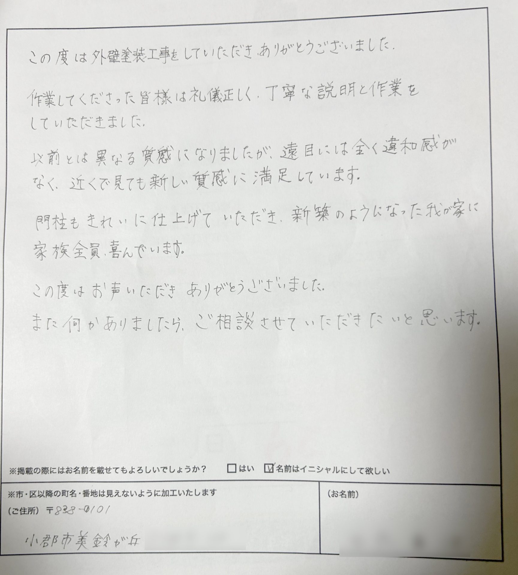 この度は外壁塗装工事をしていただきありがとうございました。作業して下さった皆様は礼儀正しく、丁寧な説明と作業をしていただきました。