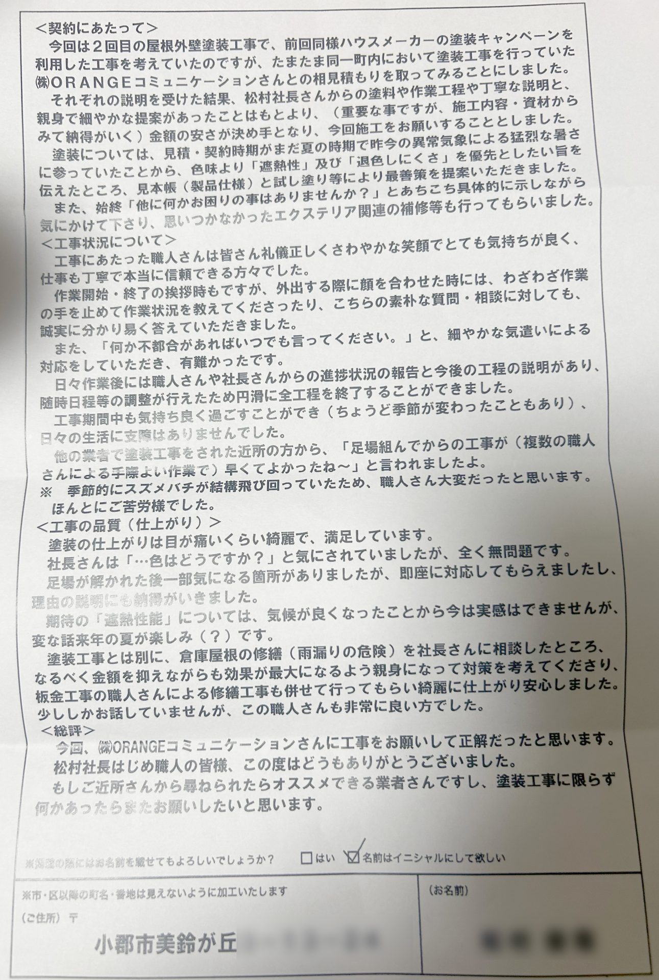 <契約にあたって>今回は2回目の屋根外壁塗装工事で、前回同様ハウスメーカーの塗装キャンペーンを利用した工事を考えていたのですが、たまたま同一町内において塗装工事を行なっていた(株)ORANGEコミュニケーションさんと相見積もりを取ってみることにしました。